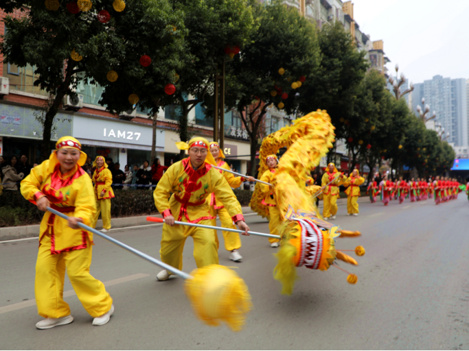 锣鼓声震彻云霄,金龙雄狮昂首腾跃,欢笑声、喝彩声传遍邻水的大街小巷,大年初一上午9时,一场主题为“瑞马迎春·与邻相约”的非遗民俗拜大年巡游活动热力开展,一公里长的展演队伍载着乡愁与欢喜,踏春而行、走进群众,让数万邻水市民在沉浸式体验中,解锁马年新春充满活力的年味。